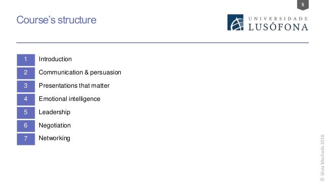 5. 5. ©SílviaMachado2016 5 Course’s structure 1 Introduction 2 Communication & persuasion 3 Presentations that matter 4 Emotional intelligence 5 Leadership 6 Negotiation 7 Networking