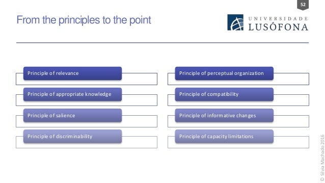 51. 51. ©SílviaMachado2016 52 From the principles to the point Principle of relevance Principle of appropriate knowledge Principle of salience Principle of discriminability Principle of perceptual organization Principle of compatibility Principle of informative changes Principle of capacity limitations