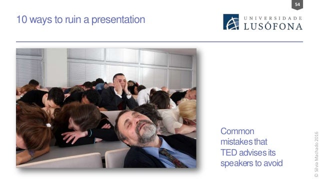 53. 53. ©SílviaMachado2016 54 10 ways to ruin a presentation Common mistakes that TED advises its speakers to avoid