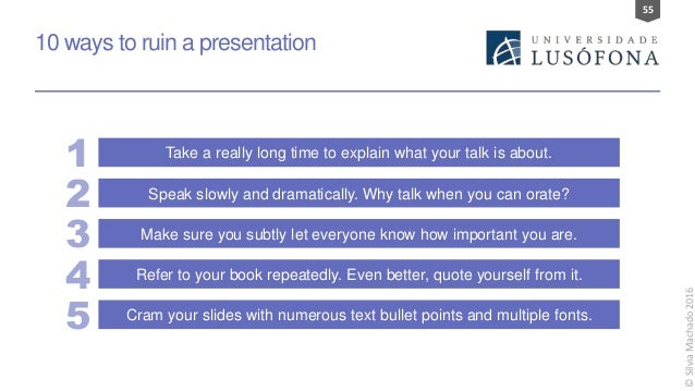 54. 54. ©SílviaMachado2016 55 10 ways to ruin a presentation Take a really long time to explain what your talk is about. Speak slowly and dramatically. Why talk when you can orate? Make sure you subtly let everyone know how important you are. Refer to your book repeatedly. Even better, quote yourself from it. Cram your slides with numerous text bullet points and multiple fonts. 1 2 3 4 5