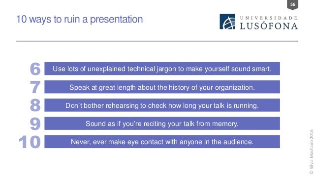 55. 55. ©SílviaMachado2016 56 10 ways to ruin a presentation Use lots of unexplained technical jargon to make yourself sound smart. Speak at great length about the history of your organization. Don’t bother rehearsing to check how long your talk is running. Sound as if you’re reciting your talk from memory. Never, ever make eye contact with anyone in the audience. 6 7 8 9 10