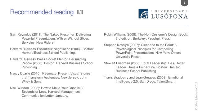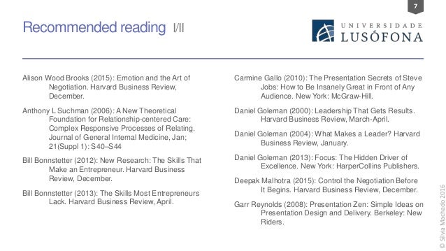 6. 6. ©SílviaMachado2016 7 Recommended reading I/II Alison Wood Brooks (2015): Emotion and the Art of Negotiation. Harvard Business Review, December. Anthony L Suchman (2006): A New Theoretical Foundation for Relationship-centered Care: Complex Responsive Processes of Relating. Journal of General Internal Medicine, Jan; 21(Suppl 1): S40–S44 Bill Bonnstetter (2012): New Research: The Skills That Make an Entrepreneur. Harvard Business Review, December. Bill Bonnstetter (2013): The Skills Most Entrepreneurs Lack. Harvard Business Review, April. Carmine Gallo (2010): The Presentation Secrets of Steve Jobs: How to Be Insanely Great in Front of Any Audience. New York: McGraw-Hill. Daniel Goleman (2000): Leadership That Gets Results. Harvard Business Review, March-April. Daniel Goleman (2004): What Makes a Leader? Harvard Business Review, January. Daniel Goleman (2013): Focus: The Hidden Driver of Excellence. New York: HarperCollins Publishers. Deepak Malhotra (2015): Control the Negotiation Before It Begins. Harvard Business Review, December. Garr Reynolds (2008): Presentation Zen: Simple Ideas on Presentation Design and Delivery. Berkeley: New Riders.