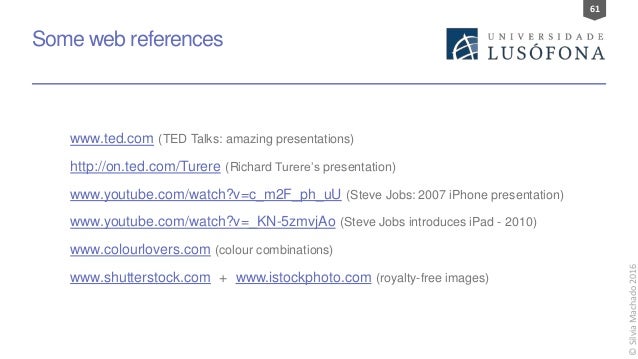 60. 60. ©SílviaMachado2016 61 Some web references www.ted.com (TED Talks: amazing presentations) http://on.ted.com/Turere (Richard Turere’s presentation) www.youtube.com/watch?v=c_m2F_ph_uU (Steve Jobs: 2007 iPhone presentation) www.youtube.com/watch?v=_KN-5zmvjAo (Steve Jobs introduces iPad - 2010) www.colourlovers.com (colour combinations) www.shutterstock.com + www.istockphoto.com (royalty-free images)