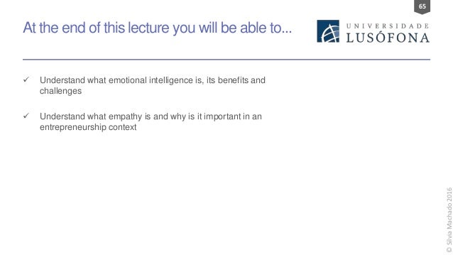 64. 64. ©SílviaMachado2016 65 At the end of this lecture you will be able to...  Understand what emotional intelligence is, its benefits and challenges  Understand what empathy is and why is it important in an entrepreneurship context