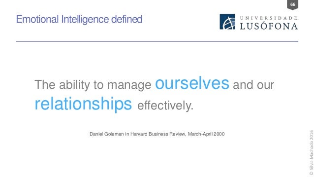 65. 65. ©SílviaMachado2016 66 Emotional Intelligence defined Daniel Goleman in Harvard Business Review, March-April 2000 The ability to manage ourselves and our relationships effectively.