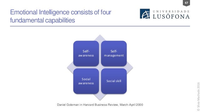 66. 66. ©SílviaMachado2016 67 Emotional Intelligence consists of four fundamental capabilities Daniel Goleman in Harvard Business Review, March-April 2000 Self- awareness Self- management Social awareness Social skill