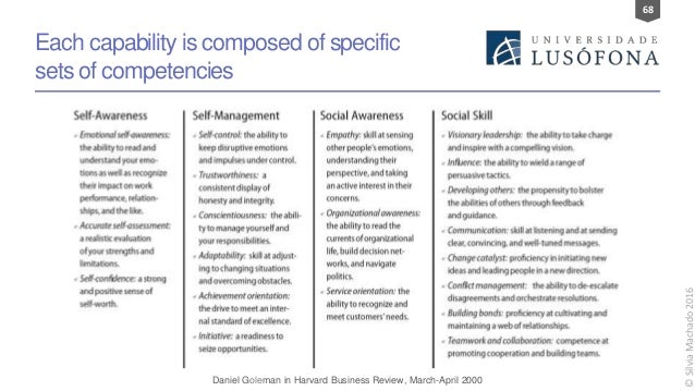 67. 67. ©SílviaMachado2016 68 Each capability is composed of specific sets of competencies Daniel Goleman in Harvard Business Review, March-April 2000