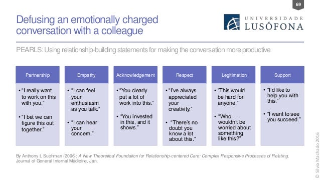 68. 68. ©SílviaMachado2016 69 Defusing an emotionally charged conversation with a colleague By Anthony L Suchman (2006): A New Theoretical Foundation for Relationship-centered Care: Complex Responsive Processes of Relating. Journal of General Internal Medicine, Jan. PEARLS:Usingrelationship-buildingstatementsfor makingthe conversation moreproductive Partnership • “I really want to work on this with you.” • “I bet we can figure this out together.” Empathy • “I can feel your enthusiasm as you talk.” • “I can hear your concern.” Acknowledgement • “You clearly put a lot of work into this.” • “You invested in this, and it shows.” Respect • “I’ve always appreciated your creativity.” • “There’s no doubt you know a lot about this.” Legitimation • “This would be hard for anyone.” • “Who wouldn’t be worried about something like this?” Support • “I’d like to help you with this.” • “I want to see you succeed.”