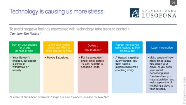 69. 69. ©SílviaMachado2016 70 Technology is causing us more stress (*) author of The 4-Hour Workweek: Escape 9-5, Live Anywhere, and Join the New Rich. Tips from Tim Ferriss * To avoidnegativefeelings associatedwith technology, take stepsto controlit Turn off your devices for shorts periods of time • Your life won't implode, but expect a period of withdrawal or anxiety. Leave your mobile phone and PDA at home one day a week • Maybe Saturdays. Devise a "not-to-do list" • For instance, don't check email before 10 a.m. Attempt to set some limits. Accept the fact you can't respond to 500 emails a day • A big part is getting over yourself. You don't have a superhuman email checking ability. Learn moderation • Make a note of how many times a day you check your email, or you scan your social networking sites. Realize when you have a problem, and make a practice of not being a slave to your devices.
