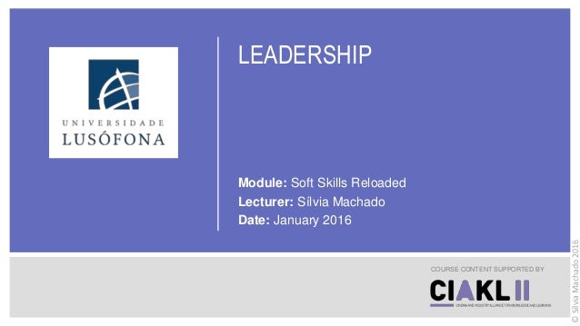 73. 73. ©SílviaMachado2016 LEADERSHIP Module: Soft Skills Reloaded Lecturer: Sílvia Machado Date: January 2016 COURSE CONTENT SUPPORTED BY
