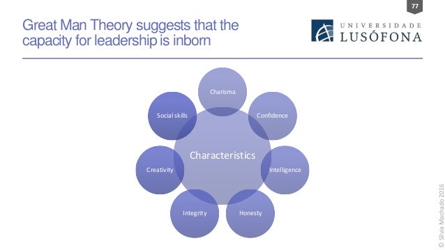 76. 76. ©SílviaMachado2016 77 Great Man Theory suggests that the capacity for leadership is inborn Characteristics Charisma Confidence Intelligence HonestyIntegrity Creativity Social skills