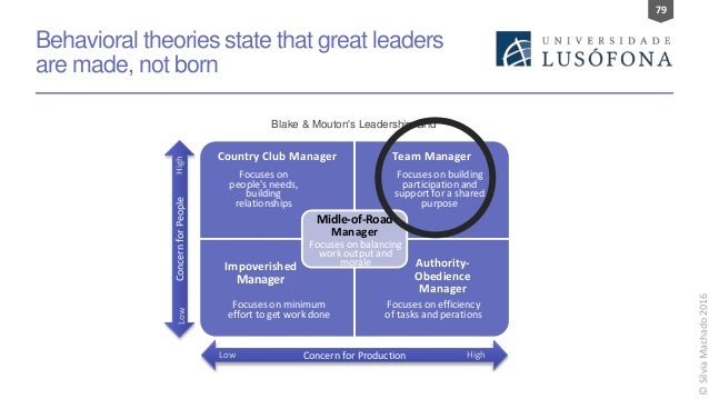 77. 77. ©SílviaMachado2016 78 Behavioral theories state that great leaders are made, not born Country Club Manager Team Manager Midle-of-Road Manager Focuses on people's needs, building relationships Focuses on building participation and support for a shared purpose Focuses on efficiency of tasks and perations Focuses on minimum effort to get work done Concern for Production HighLow ConcernforPeopleHighLow Focuses on balancing work output and moraleImpoverished Manager Authority- Obedience Manager Blake & Mouton's Leadership Grid