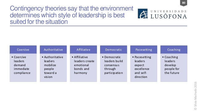 79. 79. ©SílviaMachado2016 80 Contingency theories say that the environment determines which style of leadership is best suited for the situation Coercive • Coercive leaders demand immediate compliance Authoritative • Authoritative leaders mobilize people toward a vision Affiliative • Affiliative leaders create emotional bonds and harmony Democratic • Democratic leaders build consensus through participation Pacesetting • Pacesetting leaders expect excellence and self- direction Coaching • Coaching leaders develop people for the future