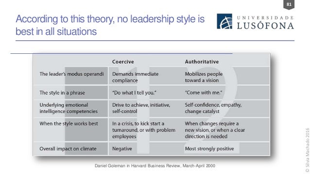 80. 80. ©SílviaMachado2016 81 According to this theory, no leadership style is best in all situations Daniel Goleman in Harvard Business Review, March-April 2000