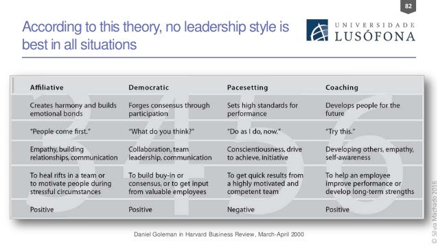 81. 81. ©SílviaMachado2016 82 According to this theory, no leadership style is best in all situations Daniel Goleman in Harvard Business Review, March-April 2000