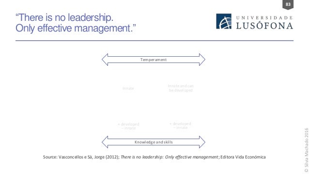 82. 82. ©SílviaMachado2016 83 “There is no leadership. Only effective management.” Source: Vasconcellos e Sá, Jorge (2012); There is no leadership: Only effective management; Editora Vida Económica Knowledge and skills Temperament Innate Innate and can be developed + developed – innate + developed – innate