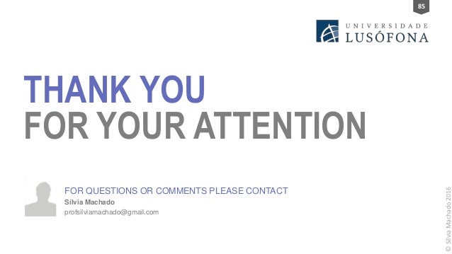 84. 84. ©SílviaMachado2016 85 THANK YOU FOR QUESTIONS OR COMMENTS PLEASE CONTACT Sílvia Machado profsilviamachado@gmail.com FOR YOUR ATTENTION