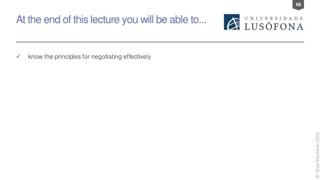 87. 87. ©SílviaMachado2016 88 At the end of this lecture you will be able to...  know the principles for negotiating effectively