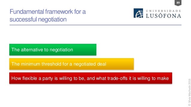 88. 88. ©SílviaMachado2016 89 Fundamental framework for a successful negotiation The alternative to negotiation The minimum threshold for a negotiated deal How flexible a party is willing to be, and what trade-offs it is willing to make