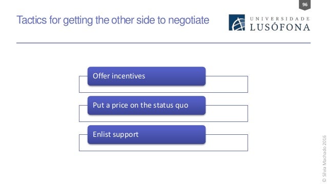 95. 95. ©SílviaMachado2016 96 Tactics for getting the other side to negotiate Offer incentives Put a price on the status quo Enlist support