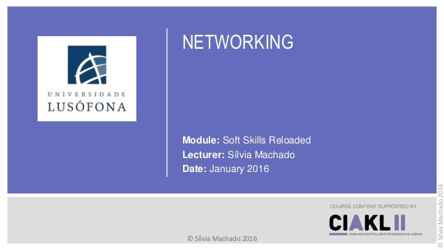 98. 98. ©SílviaMachado2016 NETWORKING Module: Soft Skills Reloaded Lecturer: Sílvia Machado Date: January 2016 COURSE CONTENT SUPPORTED BY © Sílvia Machado 2016