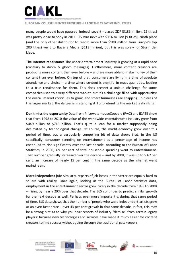 10. 10.                                                                       EUROPEAN COURSE IN ENTREPRENEURSHIP FOR THE CREATIVE INDUSTRIES                                                                 10    many people would have guessed. Indeed, seventh‐placed ZDF [$183 million, 12 titles]  was pretty close to Sony in 2011. ITV was next with $116 million [9 titles]. Ninth place  (and the only other distributor to record more than $100 million from Europe’s top  200  titles)  went  to  Bavaria  Media  [$113  million],  but  this  was  solely  for  Sturm  der  Liebe.  The Internet renaissance The wider entertainment industry is growing at a rapid pace  (contrary  to  doom  &  gloom  messages).  Furthermore,  more  content  creators  are  producing more content than ever before ‐‐ and are more able to make money of their  content than ever before. On top of that, consumers are living in a time of absolute  abundance and choice ‐‐ a time where content is plentiful in mass quantities, leading  to  a  true  renaissance  for  them.  This  does  present  a  unique  challenge  for  some  companies used to a very different market, but it’s a challenge filled with opportunity:  the overall market continues to grow, and smart businesses are snapping up pieces of  this larger market. The danger is in standing still or pretending the market is shrinking.     Don’t miss the opportunity Data from PricewaterhouseCoopers (PwC) and iDATE show  that from 1998 to 2010 the value of the worldwide entertainment industry grew from  $449  billion  to  $745  billion.  That’s  quite  a  leap  for  a  market  supposedly  being  decimated  by  technological  change.  Of  course,  the  world  economy  grew  over  this  period  of  time,  but  a  particularly  compelling  bit  of  data  shows  that,  in  the  US  specifically,  consumer  spending  on  entertainment  as  a  percentage  of  income  has  continued to rise significantly over the last decade. According to the Bureau of Labor  Statistics, in 2000, 4.9 per cent of total household spending went to entertainment.  That number gradually increased over the decade ‐‐ and by 2008, it was up to 5.62 per  cent,  an  increase  of  nearly  15  per  cent  in  the  same  decade  as  the  internet  went  mainstream.     More independent jobs Similarly, reports of job losses in the sector are equally hard to  square  with  reality.  Once  again,  looking  at  the  Bureau  of  Labor  Statistics  data,  employment in the entertainment sector grew nicely in the decade from 1998 to 2008  ‐‐ rising by nearly 20% over that decade. The BLS continues to predict similar growth  for the next decade as well. Perhaps even more importantly, during that same period  of time, BLS data shows that the number of people who were independent artists grew  at an even faster rate – over 43 per cent growth in that same decade. In fact, this may  be a strong hint as to why you hear reports of industry "demise" from certain legacy  players: because new technologies and services have made it much easier for content  creators to find success without going through the traditional gatekeepers.