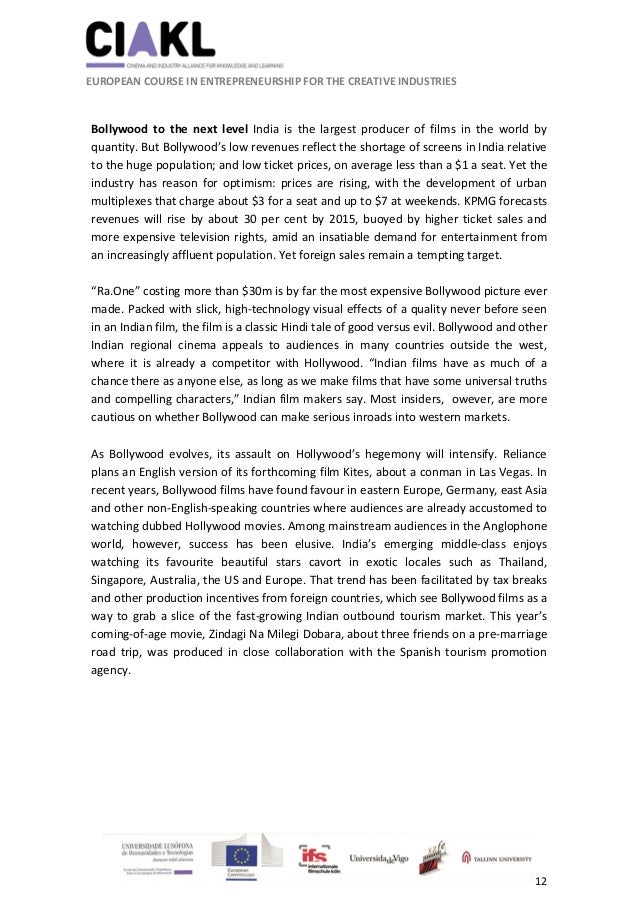 12. 12.                                                                       EUROPEAN COURSE IN ENTREPRENEURSHIP FOR THE CREATIVE INDUSTRIES                                                                 12      Bollywood  to  the  next  level  India  is  the  largest  producer  of  films  in  the  world  by  quantity. But Bollywood’s low revenues reflect the shortage of screens in India relative  to the huge population; and low ticket prices, on average less than a $1 a seat. Yet the  industry  has  reason  for  optimism:  prices  are  rising,  with  the  development  of  urban  multiplexes that charge about $3 for a seat and up to $7 at weekends. KPMG forecasts  revenues will rise by about 30 per cent by 2015, buoyed by higher ticket sales and  more expensive television rights, amid an insatiable demand for entertainment from  an increasingly affluent population. Yet foreign sales remain a tempting target.     “Ra.One” costing more than $30m is by far the most expensive Bollywood picture ever  made. Packed with slick, high‐technology visual effects of a quality never before seen  in an Indian film, the film is a classic Hindi tale of good versus evil. Bollywood and other  Indian  regional  cinema  appeals  to  audiences  in  many  countries  outside  the  west,  where  it  is  already  a  competitor  with  Hollywood.  “Indian  films  have  as  much  of  a  chance there as anyone else, as long as we make films that have some universal truths  and compelling characters,” Indian film makers say. Most insiders,  owever, are more  cautious on whether Bollywood can make serious inroads into western markets.     As  Bollywood  evolves,  its  assault  on  Hollywood’s  hegemony  will  intensify.  Reliance  plans an English version of its forthcoming film Kites, about a conman in Las Vegas. In  recent years, Bollywood films have found favour in eastern Europe, Germany, east Asia  and other non‐English‐speaking countries where audiences are already accustomed to  watching dubbed Hollywood movies. Among mainstream audiences in the Anglophone  world,  however,  success  has  been  elusive.  India’s  emerging  middle‐class  enjoys  watching  its  favourite  beautiful  stars  cavort  in  exotic  locales  such  as  Thailand,  Singapore, Australia, the US and Europe. That trend has been facilitated by tax breaks  and other production incentives from foreign countries, which see Bollywood films as a  way to grab a slice of the fast‐growing Indian outbound tourism market. This year’s  coming‐of‐age movie, Zindagi Na Milegi Dobara, about three friends on a pre‐marriage  road  trip,  was  produced  in  close  collaboration  with  the  Spanish  tourism  promotion  agency.