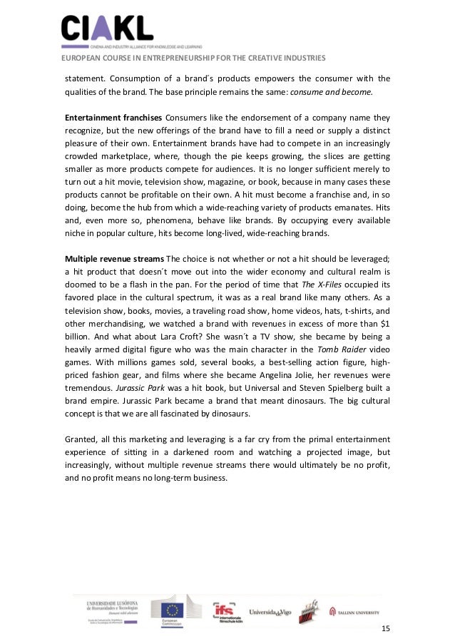 15. 15.                                                                       EUROPEAN COURSE IN ENTREPRENEURSHIP FOR THE CREATIVE INDUSTRIES                                                                 15    statement.  Consumption  of  a  brand´s  products  empowers  the  consumer  with  the  qualities of the brand. The base principle remains the same: consume and become.    Entertainment franchises Consumers like the endorsement of a company name they  recognize, but the new offerings of the brand have to fill a need or supply a distinct  pleasure of their own. Entertainment brands have had to compete in an increasingly  crowded  marketplace,  where,  though  the  pie  keeps  growing,  the  slices  are  getting  smaller as more products compete for audiences. It is no longer sufficient merely to  turn out a hit movie, television show, magazine, or book, because in many cases these  products cannot be profitable on their own. A hit must become a franchise and, in so  doing, become the hub from which a wide‐reaching variety of products emanates. Hits  and,  even  more  so,  phenomena,  behave  like  brands.  By  occupying  every  available  niche in popular culture, hits become long‐lived, wide‐reaching brands.     Multiple revenue streams The choice is not whether or not a hit should be leveraged;  a  hit  product  that  doesn´t  move  out  into  the  wider  economy  and  cultural  realm  is  doomed to be a flash in the pan. For the period of time that The X‐Files occupied its  favored place in the cultural spectrum, it was as a real brand like many others. As a  television show, books, movies, a traveling road show, home videos, hats, t‐shirts, and  other merchandising, we watched a brand with revenues in excess of more than $1  billion.  And  what  about  Lara  Croft?  She  wasn´t  a  TV  show,  she  became  by  being  a  heavily  armed  digital  figure  who  was  the  main  character  in  the  Tomb  Raider  video  games.  With  millions  games  sold,  several  books,  a  best‐selling  action  figure,  high‐ priced fashion gear, and films where she became Angelina Jolie, her revenues were  tremendous. Jurassic Park was a hit book, but Universal and Steven Spielberg built a  brand  empire.  Jurassic Park  became  a  brand  that  meant dinosaurs.  The  big cultural  concept is that we are all fascinated by dinosaurs.    Granted, all this marketing and leveraging is a far cry from the primal entertainment  experience  of  sitting  in  a  darkened  room  and  watching  a  projected  image,  but  increasingly,  without  multiple  revenue  streams  there  would  ultimately  be  no  profit,  and no profit means no long‐term business.