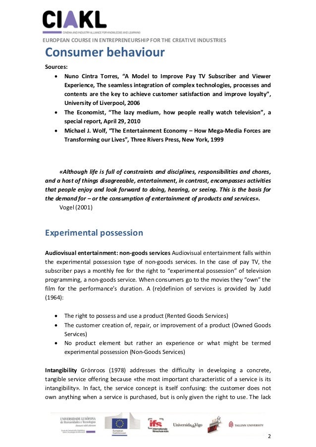 17. 17.                                                                       EUROPEAN COURSE IN ENTREPRENEURSHIP FOR THE CREATIVE INDUSTRIES  2    Consumer behaviour  Sources:    Nuno  Cintra  Torres,  “A  Model  to  Improve  Pay  TV  Subscriber  and  Viewer  Experience, The seamless integration of complex technologies, processes and  contents are the key to achieve customer satisfaction and improve loyalty”,  University of Liverpool, 2006   The  Economist,  “The  lazy  medium,  how  people  really  watch  television”,  a  special report, April 29, 2010   Michael J. Wolf, “The Entertainment Economy – How Mega‐Media Forces are  Transforming our Lives”, Three Rivers Press, New York, 1999      «Although life is full of constraints and disciplines, responsibilities and chores,  and a host of things disagreeable, entertainment, in contrast, encompasses activities  that people enjoy and look forward to doing, hearing, or seeing. This is the basis for  the demand for – or the consumption of entertainment of products and services».   Vogel (2001)     Experimental possession    Audiovisual entertainment: non‐goods services Audiovisual entertainment falls within  the  experimental  possession  type  of  non‐goods  services.  In  the  case  of  pay  TV,  the  subscriber pays a monthly fee for the right to “experimental possession” of television  programming, a non‐goods service. When consumers go to the movies they “own” the  film  for  the  performance’s  duration.  A  (re)definion  of  services  is  provided  by  Judd  (1964):      The right to possess and use a product (Rented Goods Services)   The customer creation of, repair, or improvement of a product (Owned Goods  Services)   No  product  element  but  rather  an  experience  or  what  might  be  termed  experimental possession (Non‐Goods Services)    Intangibility  Grönroos  (1978)  addresses  the  difficulty  in  developing  a  concrete,  tangible service offering because «the most important characteristic of a service is its  intangibility».  In fact, the service concept is itself confusing: the customer does not  own anything when a service is purchased, but is only given the right to use. The lack