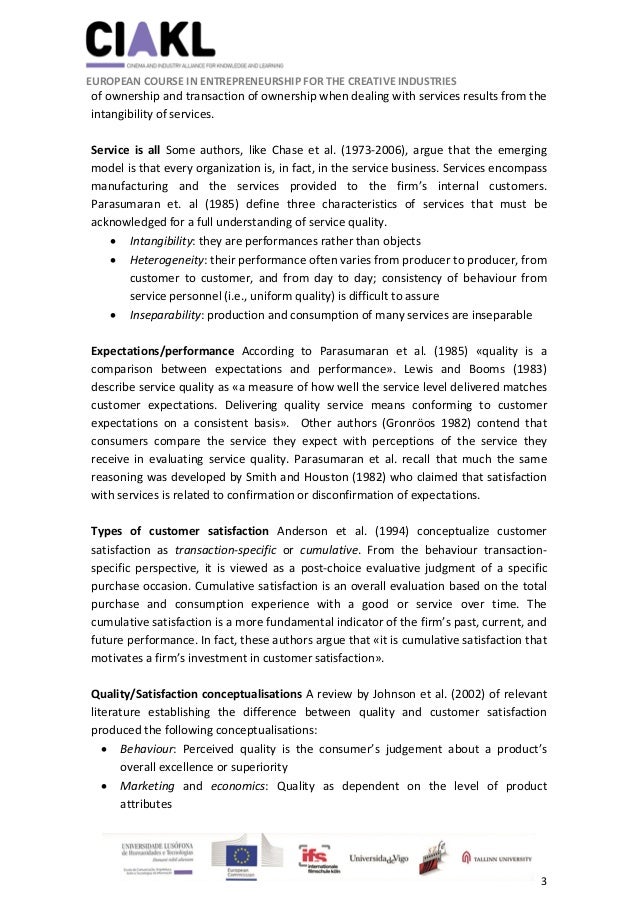 18. 18.                                                                       EUROPEAN COURSE IN ENTREPRENEURSHIP FOR THE CREATIVE INDUSTRIES  3    of ownership and transaction of ownership when dealing with services results from the  intangibility of services.    Service  is  all  Some  authors,  like  Chase  et  al.  (1973‐2006),  argue  that  the  emerging  model is that every organization is, in fact, in the service business. Services encompass  manufacturing  and  the  services  provided  to  the  firm’s  internal  customers.  Parasumaran  et.  al  (1985)  define  three  characteristics  of  services  that  must  be  acknowledged for a full understanding of service quality.    Intangibility: they are performances rather than objects   Heterogeneity: their performance often varies from producer to producer, from  customer  to  customer,  and  from  day  to  day;  consistency  of  behaviour  from  service personnel (i.e., uniform quality) is difficult to assure    Inseparability: production and consumption of many services are inseparable     Expectations/performance  According  to  Parasumaran  et  al.  (1985)  «quality  is  a  comparison  between  expectations  and  performance».  Lewis  and  Booms  (1983)  describe service quality as «a measure of how well the service level delivered matches  customer  expectations.  Delivering  quality  service  means  conforming  to  customer  expectations  on  a  consistent  basis».    Other  authors  (Gronröos  1982)  contend  that  consumers  compare  the  service  they  expect  with  perceptions  of  the  service  they  receive  in  evaluating  service  quality.  Parasumaran  et  al.  recall  that  much  the  same  reasoning was developed by Smith and Houston (1982) who claimed that satisfaction  with services is related to confirmation or disconfirmation of expectations.     Types  of  customer  satisfaction  Anderson  et  al.  (1994)  conceptualize  customer  satisfaction  as  transaction‐specific  or  cumulative.  From  the  behaviour  transaction‐ specific  perspective,  it  is  viewed  as  a  post‐choice  evaluative  judgment  of  a  specific  purchase occasion. Cumulative satisfaction is an overall evaluation based on the total  purchase  and  consumption  experience  with  a  good  or  service  over  time.  The  cumulative satisfaction is a more fundamental indicator of the firm’s past, current, and  future performance. In fact, these authors argue that «it is cumulative satisfaction that  motivates a firm’s investment in customer satisfaction».     Quality/Satisfaction conceptualisations A review by Johnson et al. (2002) of relevant  literature  establishing  the  difference  between  quality  and  customer  satisfaction  produced the following conceptualisations:   Behaviour:  Perceived  quality  is  the  consumer’s  judgement  about  a  product’s  overall excellence or superiority   Marketing  and  economics:  Quality  as  dependent  on  the  level  of  product  attributes