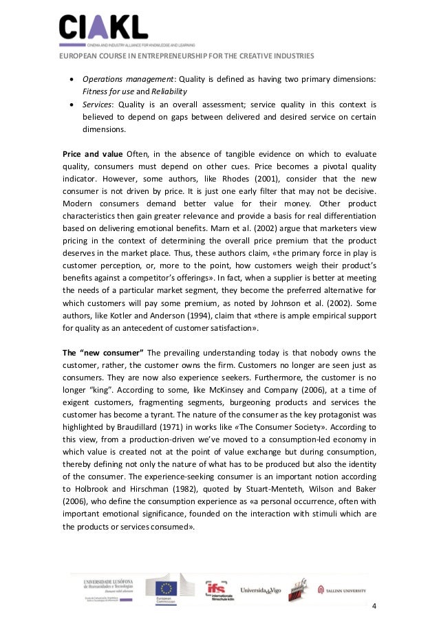 19. 19.                                                                       EUROPEAN COURSE IN ENTREPRENEURSHIP FOR THE CREATIVE INDUSTRIES  4       Operations management: Quality is defined as having two primary dimensions:  Fitness for use and Reliability    Services:  Quality  is  an  overall  assessment;  service  quality  in  this  context  is  believed  to depend  on gaps  between  delivered  and  desired  service on  certain  dimensions.    Price  and  value  Often,  in  the  absence  of  tangible  evidence  on  which  to  evaluate  quality,  consumers  must  depend  on  other  cues.  Price  becomes  a  pivotal  quality  indicator.  However,  some  authors,  like  Rhodes  (2001),  consider  that  the  new  consumer  is  not  driven by  price.  It is  just  one early  filter  that  may  not  be  decisive.  Modern  consumers  demand  better  value  for  their  money.  Other  product  characteristics then gain greater relevance and provide a basis for real differentiation  based on delivering emotional benefits. Marn et al. (2002) argue that marketers view  pricing  in  the  context  of  determining  the  overall  price  premium  that  the  product  deserves in the market place. Thus, these authors claim, «the primary force in play is  customer  perception,  or,  more  to  the  point,  how  customers  weigh  their  product’s  benefits against a competitor’s offerings». In fact, when a supplier is better at meeting  the needs of a particular market segment, they become the preferred alternative for  which  customers  will  pay  some  premium,  as  noted  by  Johnson  et  al.  (2002).  Some  authors, like Kotler and Anderson (1994), claim that «there is ample empirical support  for quality as an antecedent of customer satisfaction».    The  “new  consumer”  The  prevailing  understanding  today  is  that  nobody  owns  the  customer, rather, the customer owns the firm. Customers no longer are seen just as  consumers. They are now also experience seekers. Furthermore, the customer is no  longer  “king”.  According  to  some,  like  McKinsey  and  Company  (2006),  at  a  time  of  exigent  customers,  fragmenting  segments,  burgeoning  products  and  services  the  customer has become a tyrant. The nature of the consumer as the key protagonist was  highlighted by Braudillard (1971) in works like «The Consumer Society». According to  this view, from a production‐driven we’ve moved to a consumption‐led economy in  which  value  is  created not  at  the  point  of  value  exchange  but  during  consumption,  thereby defining not only the nature of what has to be produced but also the identity  of the consumer. The experience‐seeking consumer is an important notion according  to  Holbrook  and  Hirschman  (1982),  quoted  by  Stuart‐Menteth,  Wilson  and  Baker  (2006), who define the consumption experience as «a personal occurrence, often with  important emotional significance, founded on the interaction with stimuli which are  the products or services consumed».