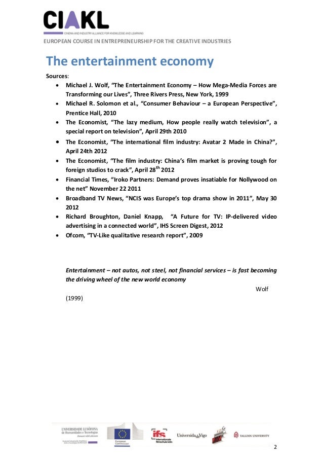 2. 2.                                                                       EUROPEAN COURSE IN ENTREPRENEURSHIP FOR THE CREATIVE INDUSTRIES                                                                 2    The entertainment economy  Sources:    Michael J. Wolf, “The Entertainment Economy – How Mega‐Media Forces are  Transforming our Lives”, Three Rivers Press, New York, 1999   Michael R. Solomon et al., “Consumer Behaviour – a European Perspective”,  Prentice Hall, 2010   The  Economist,  “The  lazy  medium,  How  people  really  watch  television”,  a  special report on television”, April 29th 2010   The Economist, “The international film industry: Avatar 2 Made in China?”,  April 24th 2012   The Economist, “The film industry: China’s film market is proving tough for  foreign studios to crack”, April 28th  2012   Financial Times, “Iroko Partners: Demand proves insatiable for Nollywood on  the net” November 22 2011    Broadband TV News, “NCIS was Europe’s top drama show in 2011”, May 30  2012   Richard  Broughton,  Daniel  Knapp,    “A  Future  for  TV:  IP‐delivered  video  advertising in a connected world”, IHS Screen Digest, 2012   Ofcom, “TV‐Like qualitative research report”, 2009    Screen Digest Insight Report    Entertainment – not autos, not steel, not financial services – is fast becoming  the driving wheel of the new world economy                                                                                                                                                             Wolf  (1999)
