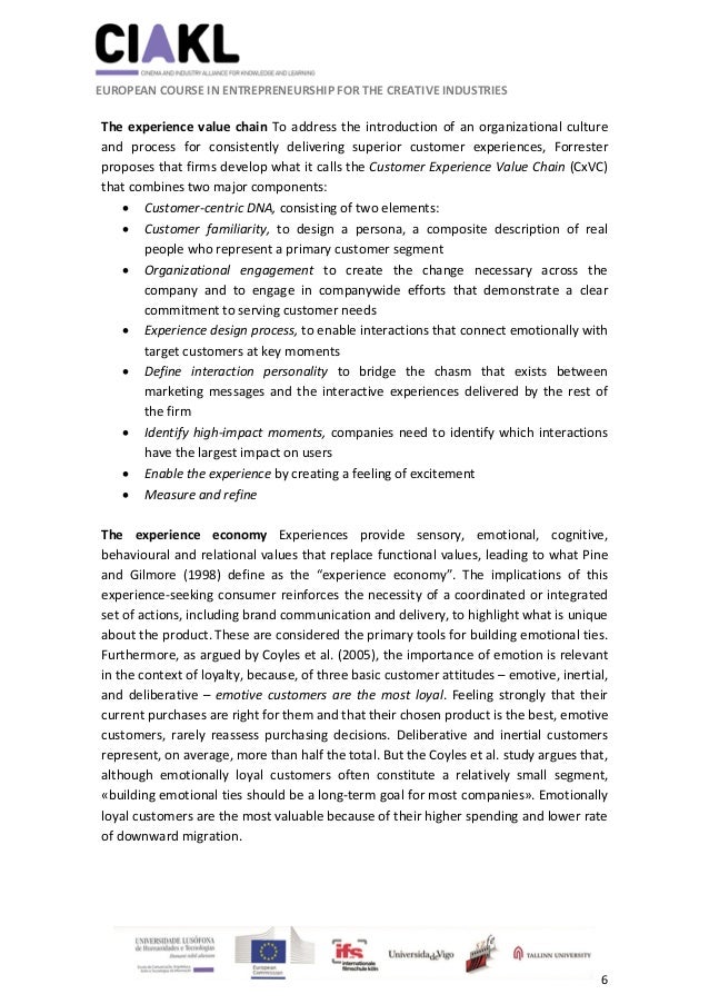 21. 21.                                                                       EUROPEAN COURSE IN ENTREPRENEURSHIP FOR THE CREATIVE INDUSTRIES  6      The experience value chain To address the introduction of an organizational culture  and  process  for  consistently  delivering  superior  customer  experiences,  Forrester  proposes that firms develop what it calls the Customer Experience Value Chain (CxVC)  that combines two major components:    Customer‐centric DNA, consisting of two elements:     Customer  familiarity,  to  design  a  persona,  a  composite  description  of  real  people who represent a primary customer segment   Organizational  engagement  to  create  the  change  necessary  across  the  company  and  to  engage  in  companywide  efforts  that  demonstrate  a  clear  commitment to serving customer needs   Experience design process, to enable interactions that connect emotionally with  target customers at key moments   Define  interaction  personality  to  bridge  the  chasm  that  exists  between  marketing messages and the interactive experiences delivered by the rest of  the firm   Identify high‐impact moments, companies need to identify which interactions  have the largest impact on users   Enable the experience by creating a feeling of excitement   Measure and refine    The  experience  economy  Experiences  provide  sensory,  emotional,  cognitive,  behavioural and relational values that replace functional values, leading to what Pine  and  Gilmore  (1998)  define  as  the  “experience  economy”.  The  implications  of  this  experience‐seeking consumer reinforces the necessity of a coordinated or integrated  set of actions, including brand communication and delivery, to highlight what is unique  about the product.  These are considered the primary tools for building emotional ties.  Furthermore, as argued by Coyles et al. (2005), the importance of emotion is relevant  in the context of loyalty, because, of three basic customer attitudes – emotive, inertial,  and deliberative – emotive customers are the most loyal. Feeling strongly that their  current purchases are right for them and that their chosen product is the best, emotive  customers,  rarely  reassess  purchasing  decisions.  Deliberative  and  inertial  customers  represent, on average, more than half the total. But the Coyles et al. study argues that,  although  emotionally  loyal  customers  often  constitute  a  relatively  small  segment,  «building emotional ties should be a long‐term goal for most companies». Emotionally  loyal customers are the most valuable because of their higher spending and lower rate  of downward migration.