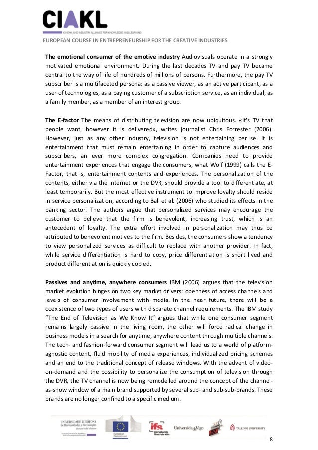23. 23.                                                                       EUROPEAN COURSE IN ENTREPRENEURSHIP FOR THE CREATIVE INDUSTRIES  8      The emotional consumer of the emotive industry Audiovisuals operate in a strongly  motivated  emotional  environment.  During  the  last  decades  TV  and  pay  TV  became  central to the way of life of hundreds of millions of persons. Furthermore, the pay TV  subscriber is a multifaceted persona: as a passive viewer, as an active participant, as a  user of technologies, as a paying customer of a subscription service, as an individual, as  a family member, as a member of an interest group.    The  E‐factor  The  means  of  distributing  television  are  now  ubiquitous.  «It's  TV  that  people  want,  however  it  is  delivered»,  writes  journalist  Chris  Forrester  (2006).  However,  just  as  any  other  industry,  television  is  not  entertaining  per  se.  It  is  entertainment  that  must  remain  entertaining  in  order  to  capture  audiences  and  subscribers,  an  ever  more  complex  congregation.  Companies  need  to  provide  entertainment experiences that engage the consumers, what Wolf (1999) calls the E‐ Factor,  that  is,  entertainment  contents  and  experiences.  The  personalization  of  the  contents, either via the internet or the DVR, should provide a tool to differentiate, at  least temporarily. But the most effective instrument to improve loyalty should reside  in service personalization, according to Ball et al. (2006) who studied its effects in the  banking  sector.  The  authors  argue  that  personalized  services  may  encourage  the  customer  to  believe  that  the  firm  is  benevolent,  increasing  trust,  which  is  an  antecedent  of  loyalty.  The  extra  effort  involved  in  personalization  may  thus  be  attributed to benevolent motives to the firm. Besides, the consumers show a tendency  to  view  personalized  services  as  difficult  to  replace  with  another  provider.  In  fact,  while  service  differentiation  is  hard  to  copy,  price  differentiation  is  short  lived  and  product differentiation is quickly copied.    Passives  and  anytime,  anywhere  consumers  IBM  (2006)  argues  that  the  television  market evolution hinges on two key market drivers: openness of access channels and  levels  of  consumer  involvement  with  media.  In  the  near  future,  there  will  be  a  coexistence of two types of users with disparate channel requirements. The IBM study  “The  End  of  Television  as  We  Know  It”  argues  that  while  one  consumer  segment  remains  largely  passive  in  the  living  room,  the  other  will  force  radical  change  in  business models in a search for anytime, anywhere content through multiple channels.  The tech‐ and fashion‐forward consumer segment will lead us to a world of platform‐ agnostic content, fluid mobility of media experiences, individualized pricing schemes  and an end to the traditional concept of release windows. With the advent of video‐ on‐demand and the possibility to personalize the consumption of television through  the DVR, the TV channel is now being remodelled around the concept of the channel‐ as‐show window of a main brand supported by several sub‐ and sub‐sub‐brands. These  brands are no longer confined to a specific medium.