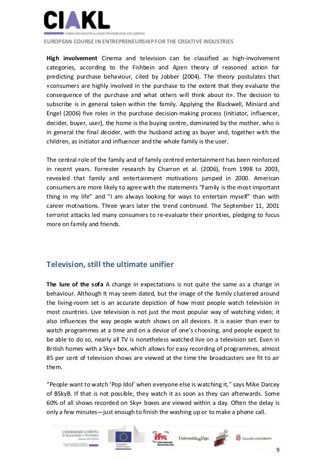 24. 24.                                                                       EUROPEAN COURSE IN ENTREPRENEURSHIP FOR THE CREATIVE INDUSTRIES  9      High  involvement  Cinema  and  television  can  be  classified  as  high‐involvement  categories,  according  to  the  Fishbein  and  Ajzen  theory  of  reasoned  action  for  predicting  purchase  behaviour,  cited  by  Jobber  (2004).  The  theory  postulates  that  «consumers are highly involved in the purchase to the extent that they evaluate the  consequence  of  the  purchase  and  what  others  will  think  about  it».  The  decision  to  subscribe is in general taken within the family. Applying the Blackwell, Miniard and  Engel (2006) five roles in the purchase decision‐making process (initiator, influencer,  decider, buyer, user), the home is the buying centre, dominated by the mother, who is  in general the final decider, with the husband acting as buyer and, together with the  children, as initiator and influencer and the whole family is the user.     The central role of the family and of family centred entertainment has been reinforced  in  recent  years.  Forrester  research  by  Charron  et  al.  (2006),  from  1998  to  2003,  revealed  that  family  and  entertainment  motivations  jumped  in  2000.  American  consumers are more likely to agree with the statements “Family is the most important  thing  in  my  life”  and  “I  am  always  looking  for  ways  to  entertain  myself”  than  with  career motivations. Three years later the trend continued. The September 11, 2001  terrorist attacks led many consumers to re‐evaluate their priorities, pledging to focus  more on family and friends.      Television, still the ultimate unifier    The lure of the sofa A change in expectations is not quite the same as a change in  behaviour. Although It may seem dated, but the image of the family clustered around  the living‐room set is an accurate depiction of how most people watch television in  most countries. Live television is not just the most popular way of watching video; it  also influences the way people watch shows on all devices. It is easier than ever to  watch programmes at a time and on a device of one’s choosing, and people expect to  be able to do so, nearly all TV is nonetheless watched live on a television set. Even in  British homes with a Sky+ box, which allows for easy recording of programmes, almost  85 per cent of television shows are viewed at the time the broadcasters see fit to air  them.   “People want to watch ‘Pop Idol’ when everyone else is watching it,” says Mike Darcey  of BSkyB. If that is not possible, they watch it as soon as they can afterwards. Some  60% of all shows recorded on Sky+ boxes are viewed within a day. Often the delay is  only a few minutes—just enough to finish the washing up or to make a phone call.