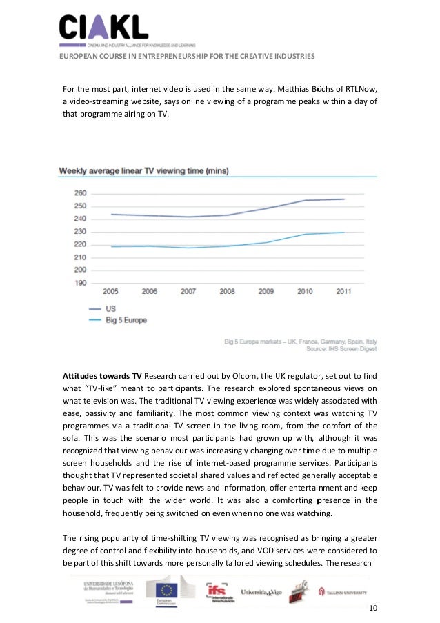 25. 25.                EUROP     For t a vid that      Attit what what ease prog sofa. recog scree thou beha peop hous   The  degr be pa                         PEAN COURS the most pa deo‐streami programme udes towar t  “TV‐like”  t television  ,  passivity  rammes via .  This  was  gnized that en  househo ght that TV aviour. TV w ple  in  touc sehold, freq rising popu ee of contr art of this s                        SE IN ENTRE art, internet ng website e airing on T rds TV Rese meant  to  was. The tr and  familia a a traditio the  scenar  viewing be olds  and  th V represente was felt to p h  with  the quently bein ularity of tim ol and flexi hift toward            EPRENEURSH t video is us , says onlin TV.   earch carrie participants raditional T arity.  The  m onal TV scre rio  most  pa ehaviour wa he  rise  of  i ed societal  provide new e  wider  wo ng switched me‐shifting  bility into h s more pers HIP FOR THE  sed in the s ne viewing o ed out by Of s.  The  rese TV viewing e most  comm een in the  articipants  as increasin nternet‐bas shared valu ws and infor orld.  It  was  on even w TV viewing households, sonally tailo CREATIVE IN same way. M of a progra fcom, the U earch  explo experience  mon  viewing living room had  grown gly changin sed  progra ues and ref rmation, off s  also  a  co hen no one g was recog , and VOD s ored viewin NDUSTRIES  Matthias Bü mme peaks UK regulato red  sponta was widely g  context  w m, from the n  up  with,  g over time mme  servic lected gene fer entertai omforting  p e was watch gnised as br services we g schedules üchs of RTL s within a d r, set out to aneous  view y associated was  watchin e comfort o although  it e due to mu ces.  Partici erally accep nment and presence  in hing.  ringing a gr re consider s. The resea 10  LNow,  day of  o find  ws  on  d with  ng  TV  of the  t  was  ultiple  pants  ptable  keep  n  the  reater  red to  arch