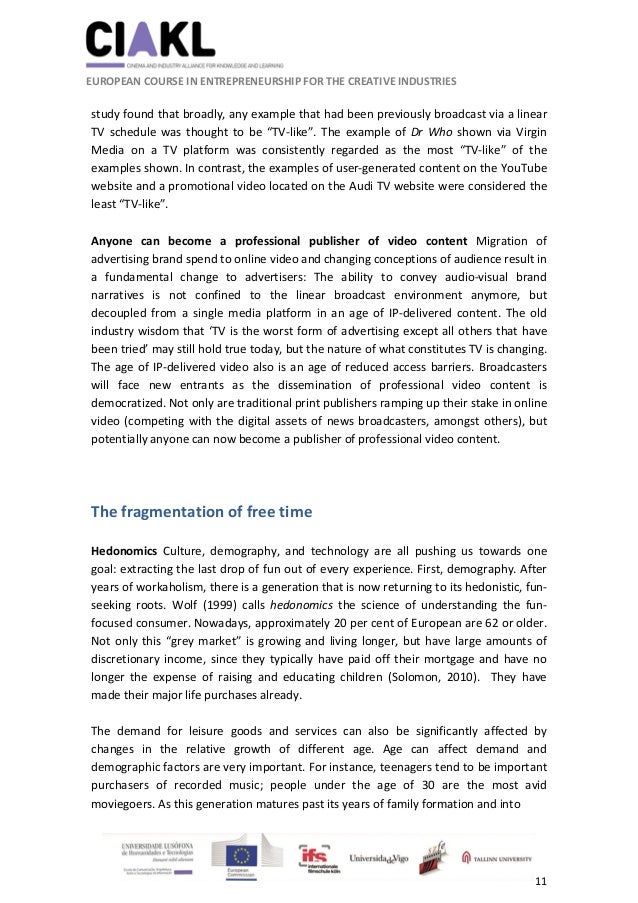 26. 26.                                                                       EUROPEAN COURSE IN ENTREPRENEURSHIP FOR THE CREATIVE INDUSTRIES  11      study found that broadly, any example that had been previously broadcast via a linear  TV  schedule  was  thought  to  be  “TV‐like”.  The  example  of  Dr  Who  shown  via  Virgin  Media  on  a  TV  platform  was  consistently  regarded  as  the  most  “TV‐like”  of  the  examples shown. In contrast, the examples of user‐generated content on the YouTube  website and a promotional video located on the Audi TV website were considered the  least “TV‐like”.    Anyone  can  become  a  professional  publisher  of  video  content  Migration  of  advertising brand spend to online video and changing conceptions of audience result in  a  fundamental  change  to  advertisers:  The  ability  to  convey  audio‐visual  brand  narratives  is  not  confined  to  the  linear  broadcast  environment  anymore,  but  decoupled  from  a  single  media  platform  in  an  age  of  IP‐delivered  content.  The  old  industry wisdom that ‘TV is the worst form of advertising except all others that have  been tried’ may still hold true today, but the nature of what constitutes TV is changing.  The age of IP‐delivered video also is an age of reduced access barriers. Broadcasters  will  face  new  entrants  as  the  dissemination  of  professional  video  content  is  democratized. Not only are traditional print publishers ramping up their stake in online  video (competing with the digital assets of news broadcasters, amongst others), but  potentially anyone can now become a publisher of professional video content.      The fragmentation of free time    Hedonomics  Culture,  demography,  and  technology  are  all  pushing  us  towards  one  goal: extracting the last drop of fun out of every experience. First, demography. After  years of workaholism, there is a generation that is now returning to its hedonistic, fun‐ seeking  roots.  Wolf  (1999)  calls  hedonomics  the  science  of  understanding  the  fun‐ focused consumer. Nowadays, approximately 20 per cent of European are 62 or older.  Not only this “grey market” is growing and living longer, but have large amounts of  discretionary income, since they typically have paid off their mortgage and have no  longer  the  expense  of  raising  and  educating  children  (Solomon,  2010).    They  have  made their major life purchases already.      The  demand  for  leisure  goods  and  services  can  also  be  significantly  affected  by  changes  in  the  relative  growth  of  different  age.  Age  can  affect  demand  and  demographic factors are very important. For instance, teenagers tend to be important  purchasers  of  recorded  music;  people  under  the  age  of  30  are  the  most  avid  moviegoers. As this generation matures past its years of family formation and into