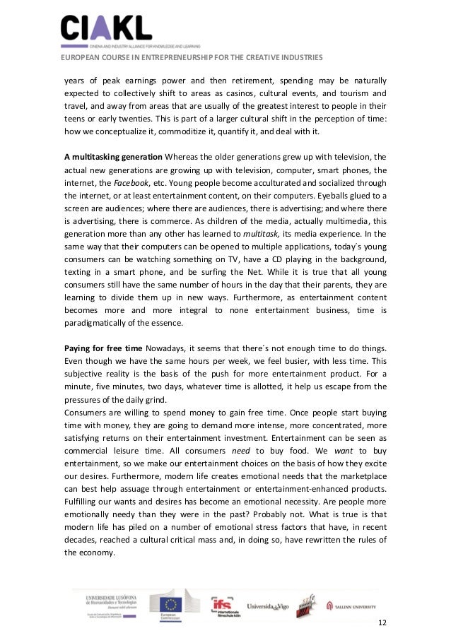 27. 27.                                                                       EUROPEAN COURSE IN ENTREPRENEURSHIP FOR THE CREATIVE INDUSTRIES  12      years  of  peak  earnings  power  and  then  retirement,  spending  may  be  naturally  expected  to  collectively  shift  to  areas  as  casinos,  cultural  events,  and  tourism  and  travel, and away from areas that are usually of the greatest interest to people in their  teens or early twenties. This is part of a larger cultural shift in the perception of time:  how we conceptualize it, commoditize it, quantify it, and deal with it.    A multitasking generation Whereas the older generations grew up with television, the  actual new generations are growing up with television, computer, smart phones, the  internet, the Facebook, etc. Young people become acculturated and socialized through  the internet, or at least entertainment content, on their computers. Eyeballs glued to a  screen are audiences; where there are audiences, there is advertising; and where there  is advertising, there is commerce. As children of the media, actually multimedia, this  generation more than any other has learned to multitask, its media experience. In the  same way that their computers can be opened to multiple applications, today´s young  consumers can be watching something on TV, have a CD playing in the background,  texting  in  a  smart  phone,  and  be  surfing  the  Net.  While  it  is  true  that  all  young  consumers still have the same number of hours in the day that their parents, they are  learning  to  divide  them  up  in  new  ways.  Furthermore,  as  entertainment  content  becomes  more  and  more  integral  to  none  entertainment  business,  time  is  paradigmatically of the essence.    Paying for free time Nowadays, it seems that there´s not enough time to do things.  Even though we have the same hours per week, we feel busier, with less time. This  subjective  reality  is  the  basis  of  the  push  for  more  entertainment  product.  For  a  minute, five minutes, two days, whatever time is allotted, it help us escape from the  pressures of the daily grind.  Consumers  are  willing  to  spend  money  to  gain  free  time.  Once  people  start  buying  time with money, they are going to demand more intense, more concentrated, more  satisfying returns on their entertainment investment. Entertainment can be seen as  commercial  leisure  time.  All  consumers  need  to  buy  food.  We  want  to  buy  entertainment, so we make our entertainment choices on the basis of how they excite  our desires. Furthermore, modern life creates emotional needs that the marketplace  can  best  help  assuage  through  entertainment  or  entertainment‐enhanced  products.  Fulfilling our wants and desires has become an emotional necessity. Are people more  emotionally  needy  than  they  were  in  the  past?  Probably  not.  What  is  true  is  that  modern  life  has  piled  on  a  number  of  emotional  stress  factors  that  have,  in  recent  decades, reached a cultural critical mass and, in doing so, have rewritten the rules of  the economy.