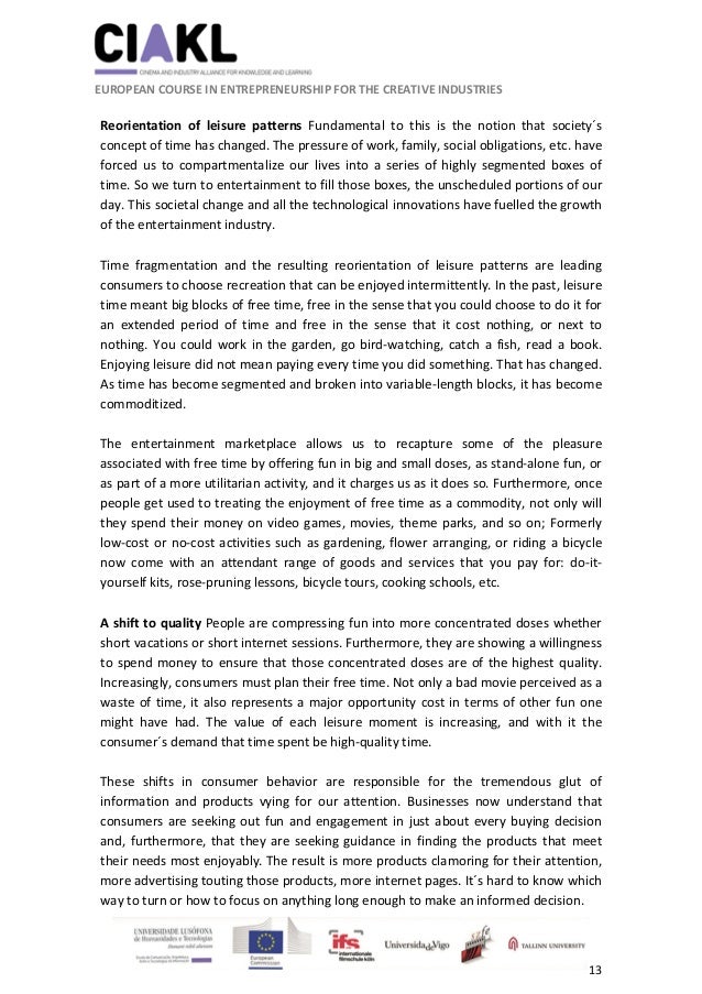 28. 28.                                                                       EUROPEAN COURSE IN ENTREPRENEURSHIP FOR THE CREATIVE INDUSTRIES  13      Reorientation  of  leisure  patterns  Fundamental  to  this  is  the  notion  that  society´s  concept of time has changed. The pressure of work, family, social obligations, etc. have  forced  us  to  compartmentalize  our  lives  into  a  series  of  highly  segmented  boxes  of  time. So we turn to entertainment to fill those boxes, the unscheduled portions of our  day. This societal change and all the technological innovations have fuelled the growth  of the entertainment industry.    Time  fragmentation  and  the  resulting  reorientation  of  leisure  patterns  are  leading  consumers to choose recreation that can be enjoyed intermittently. In the past, leisure  time meant big blocks of free time, free in the sense that you could choose to do it for  an  extended  period  of  time  and  free  in  the  sense  that  it  cost  nothing,  or  next  to  nothing. You could work in the garden, go bird‐watching, catch a fish, read a book.  Enjoying leisure did not mean paying every time you did something. That has changed.  As time has become segmented and broken into variable‐length blocks, it has become  commoditized.     The  entertainment  marketplace  allows  us  to  recapture  some  of  the  pleasure  associated with free time by offering fun in big and small doses, as stand‐alone fun, or  as part of a more utilitarian activity, and it charges us as it does so. Furthermore, once  people get used to treating the enjoyment of free time as a commodity, not only will  they spend their money on video games, movies, theme parks, and so on; Formerly  low‐cost or no‐cost activities such as gardening, flower arranging, or riding a bicycle  now  come  with  an  attendant  range  of  goods  and  services  that  you  pay  for:  do‐it‐ yourself kits, rose‐pruning lessons, bicycle tours, cooking schools, etc.    A shift to quality People are compressing fun into more concentrated doses whether  short vacations or short internet sessions. Furthermore, they are showing a willingness  to spend money to ensure that those concentrated doses are of the highest quality.  Increasingly, consumers must plan their free time. Not only a bad movie perceived as a  waste of time, it also represents a major opportunity cost in terms of other fun one  might  have  had.  The  value  of  each  leisure  moment  is  increasing,  and  with  it  the  consumer´s demand that time spent be high‐quality time.    These  shifts  in  consumer  behavior  are  responsible  for  the  tremendous  glut  of  information  and  products  vying  for  our  attention.  Businesses  now  understand  that  consumers are seeking out fun and engagement in just about every buying decision  and, furthermore, that they are seeking guidance in finding the products that meet  their needs most enjoyably. The result is more products clamoring for their attention,  more advertising touting those products, more internet pages. It´s hard to know which  way to turn or how to focus on anything long enough to make an informed decision.