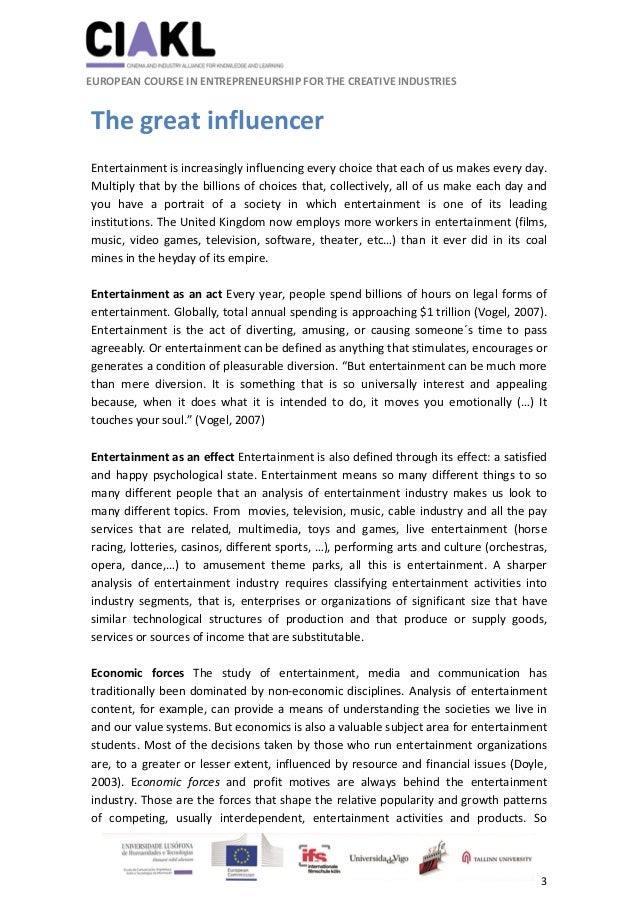 3. 3.                                                                       EUROPEAN COURSE IN ENTREPRENEURSHIP FOR THE CREATIVE INDUSTRIES                                                                 3    The great influencer    Entertainment is increasingly influencing every choice that each of us makes every day.  Multiply that by the billions of choices that, collectively, all of us make each day and  you  have  a  portrait  of  a  society  in  which  entertainment  is  one  of  its  leading  institutions. The United Kingdom now employs more workers in entertainment (films,  music,  video  games,  television,  software,  theater,  etc…)  than  it  ever  did  in  its  coal  mines in the heyday of its empire.    Entertainment as an act Every year, people spend billions of hours on legal forms of  entertainment. Globally, total annual spending is approaching $1 trillion (Vogel, 2007).  Entertainment  is  the  act  of  diverting,  amusing,  or  causing  someone´s  time  to  pass  agreeably. Or entertainment can be defined as anything that stimulates, encourages or  generates a condition of pleasurable diversion. “But entertainment can be much more  than  mere  diversion.  It  is  something  that  is  so  universally  interest  and  appealing  because,  when  it  does  what  it  is  intended  to  do,  it  moves  you  emotionally  (…)  It  touches your soul.” (Vogel, 2007)    Entertainment as an effect Entertainment is also defined through its effect: a satisfied  and happy psychological state. Entertainment means so many different things to so  many  different  people  that  an  analysis  of  entertainment  industry  makes  us  look  to  many different topics. From  movies, television, music, cable industry and all the pay  services  that  are  related,  multimedia,  toys  and  games,  live  entertainment  (horse  racing, lotteries, casinos, different sports, …), performing arts and culture (orchestras,  opera,  dance,…)  to  amusement  theme  parks,  all  this  is  entertainment.  A  sharper  analysis  of  entertainment  industry  requires  classifying  entertainment  activities  into  industry  segments,  that  is,  enterprises  or  organizations  of  significant  size  that  have  similar  technological  structures  of  production  and  that  produce  or  supply  goods,  services or sources of income that are substitutable.    Economic  forces  The  study  of  entertainment,  media  and  communication  has  traditionally been dominated by non‐economic disciplines. Analysis of entertainment  content, for example, can provide a means of understanding the societies we live in  and our value systems. But economics is also a valuable subject area for entertainment  students. Most of the decisions taken by those who run entertainment organizations  are, to a greater or lesser extent, influenced by resource and financial issues (Doyle,  2003).  Economic  forces  and  profit  motives  are  always  behind  the  entertainment  industry. Those are the forces that shape the relative popularity and growth patterns  of  competing,  usually  interdependent,  entertainment  activities  and  products.  So