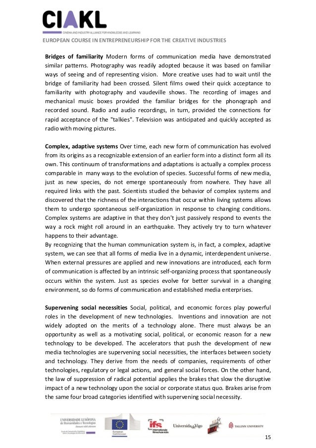 30. 30.                                                                       EUROPEAN COURSE IN ENTREPRENEURSHIP FOR THE CREATIVE INDUSTRIES  15      Bridges  of  familiarity  Modern  forms  of  communication  media  have  demonstrated  similar patterns. Photography was readily adopted because it was based on familiar  ways of seeing and of representing vision.  More creative uses had to wait until the  bridge  of  familiarity  had  been  crossed.  Silent  films  owed  their  quick  acceptance  to  familiarity  with  photography  and  vaudeville  shows.  The  recording  of  images  and  mechanical  music  boxes  provided  the  familiar  bridges  for  the  phonograph  and  recorded  sound.  Radio  and  audio  recordings,  in  turn,  provided  the  connections  for  rapid acceptance of the "talkies". Television was anticipated and quickly accepted as  radio with moving pictures.    Complex, adaptive systems Over time, each new form of communication has evolved  from its origins as a recognizable extension of an earlier form into a distinct form all its  own. This continuum of transformations and adaptations is actually a complex process  comparable in  many ways to the evolution of species. Successful forms of new media,  just  as  new  species,  do  not  emerge  spontaneously  from  nowhere.  They  have  all  required links with the past. Scientists studied the behavior of complex systems and  discovered that the richness of the interactions that occur within living systems allows  them  to  undergo  spontaneous  self‐organization  in  response  to  changing  conditions.  Complex systems are adaptive in that they don't just passively respond to events the  way  a  rock  might  roll  around  in  an  earthquake.  They  actively  try  to  turn  whatever  happens to their advantage.   By recognizing that the human communication system is, in fact, a complex, adaptive  system, we can see that all forms of media live in a dynamic, interdependent universe.  When external pressures are applied and new innovations are introduced, each form  of communication is affected by an intrinsic self‐organizing process that spontaneously  occurs  within  the  system.  Just  as  species  evolve  for  better  survival  in  a  changing  environment, so do forms of communication and established media enterprises.     Supervening  social  necessities  Social,  political,  and  economic  forces  play  powerful  roles  in  the  development  of  new  technologies.    Inventions  and  innovation  are  not  widely  adopted  on  the  merits  of  a  technology  alone.  There  must  always  be  an  opportunity  as  well  as  a  motivating  social,  political,  or  economic  reason  for  a  new  technology  to  be  developed.  The  accelerators  that  push  the  development  of  new  media technologies are supervening social necessities, the interfaces between society  and  technology.  They  derive  from  the  needs  of  companies,  requirements  of  other  technologies, regulatory or legal actions, and general social forces. On the other hand,  the law of suppression of radical potential applies the brakes that slow the disruptive  impact of a new technology upon the social or corporate status quo. Brakes arise from  the same four broad categories identified with supervening social necessity.