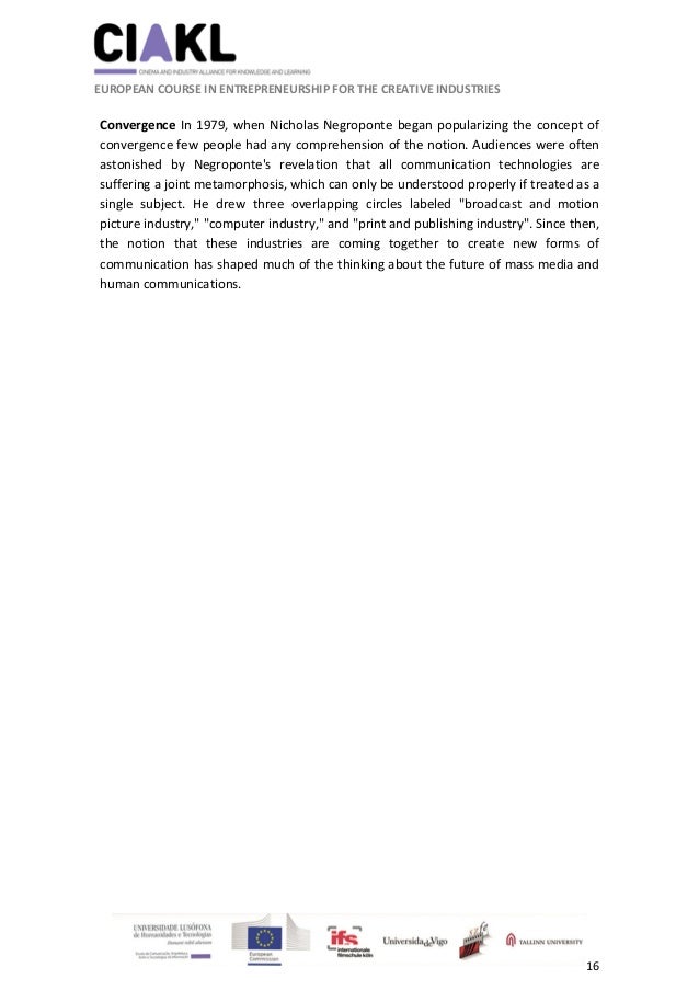 31. 31.                                                                       EUROPEAN COURSE IN ENTREPRENEURSHIP FOR THE CREATIVE INDUSTRIES  16      Convergence In 1979, when Nicholas Negroponte began popularizing the concept of  convergence few people had any comprehension of the notion. Audiences were often  astonished  by  Negroponte's  revelation  that  all  communication  technologies  are  suffering a joint metamorphosis, which can only be understood properly if treated as a  single  subject.  He  drew  three  overlapping  circles  labeled  "broadcast  and  motion  picture industry," "computer industry," and "print and publishing industry". Since then,  the  notion  that  these  industries  are  coming  together  to  create  new  forms  of  communication has shaped much of the thinking about the future of mass media and  human communications.