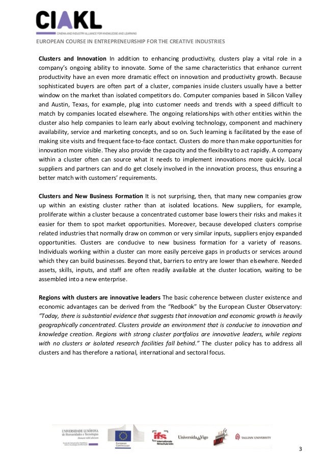 34. 34.                                                                       EUROPEAN COURSE IN ENTREPRENEURSHIP FOR THE CREATIVE INDUSTRIES  3    Clusters  and  Innovation  In  addition  to  enhancing  productivity,  clusters  play  a  vital  role  in  a  company’s  ongoing  ability  to  innovate.  Some  of  the  same  characteristics  that  enhance  current  productivity have an even more dramatic effect on innovation and productivity growth. Because  sophisticated buyers are often part of a cluster, companies inside clusters usually have a better  window on the market than isolated competitors do. Computer companies based in Silicon Valley  and  Austin,  Texas,  for  example,  plug  into  customer  needs  and  trends  with  a  speed  difficult  to  match by companies located elsewhere. The ongoing relationships with other entities within the  cluster also help companies to learn early about evolving technology, component and machinery  availability, service and marketing concepts, and so on. Such learning is facilitated by the ease of  making site visits and frequent face‐to‐face contact. Clusters do more than make opportunities for  innovation more visible. They also provide the capacity and the flexibility to act rapidly. A company  within  a  cluster  often  can  source  what  it  needs  to  implement  innovations  more  quickly.  Local  suppliers and partners can and do get closely involved in the innovation process, thus ensuring a  better match with customers’ requirements.    Clusters and New Business Formation It is not surprising, then, that many new companies grow  up  within  an  existing  cluster  rather  than  at  isolated  locations.  New  suppliers,  for  example,  proliferate within a cluster because a concentrated customer base lowers their risks and makes it  easier  for  them  to  spot  market  opportunities.  Moreover,  because  developed  clusters  comprise  related industries that normally draw on common or very similar inputs, suppliers enjoy expanded  opportunities.  Clusters  are  conducive  to  new  business  formation  for  a  variety  of  reasons.  Individuals working within a cluster can more easily perceive gaps in products or services around  which they can build businesses. Beyond that, barriers to entry are lower than elsewhere. Needed  assets,  skills,  inputs,  and  staff  are  often  readily  available  at  the  cluster  location,  waiting  to  be  assembled into a new enterprise.    Regions with clusters are innovative leaders The basic coherence between cluster existence and  economic advantages can be derived from the “Redbook” by the European Cluster Observatory:  “Today, there is substantial evidence that suggests that innovation and economic growth is heavily  geographically concentrated. Clusters provide an environment that is conducive to innovation and  knowledge creation. Regions with strong cluster portfolios are innovative leaders, while regions  with no clusters or isolated research facilities fall behind.” The cluster policy has to address  all  clusters and has therefore a national, international and sectoral focus.
