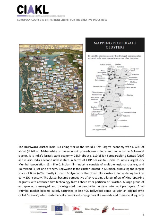 35. 35.                       EUROPEA           The Bol about $ cluster.  and is a Mumba Bollywo share o early 20 migrant entrepr Mumba called “                        AN COURSE I llywood clu $1 trillion. M It is India’s also India’s  ai  (populatio ood is just o of films (40% 0th century ts with adva reneurs  em ai market b masala”, w                       IN ENTREPRE uster India  Maharashtr s largest sta second ric on  13  milli one of them %) mostly i . The cluste anced film  merged  and ecame quic which system      ENEURSHIP  is a rising  a is the eco ate econom chest state  on).  Indian m. Bollywoo n Hindi. Bo er became c technology   disintegra ckly saturat matically co FOR THE CR star as the onomic pow my GSDP ab in terms o n  film  indus od is the clu ollywood is  competitive y from Laho ated  the  p ted in late 4 mbined sto EATIVE INDU e world’s 12 werhouse o bout $ 110  f GDP per  stry  consist uster locate the oldest  e after recei ore after pa roduction  40s, Bollyw ory genres li USTRIES  2th largest  of India and billion com capita. Hom s  of  multip ed in Mumb film cluster ving a large rtition of P system  int wood came  ke comedy economy w d home to t mparable to me to India ple  regional bai, produci r in India, d e inflow of H Pakistan. A l to  multiple up with an y and roman with a GDP the Bollywo  Kansas (US a’s largest c l  clusters,  a ing the larg dating back Hindi speak large group layers.  Af n original st nce along w 4    P of  ood  SA)  city  and  gest  k to  king  p of  fter  tyle  with