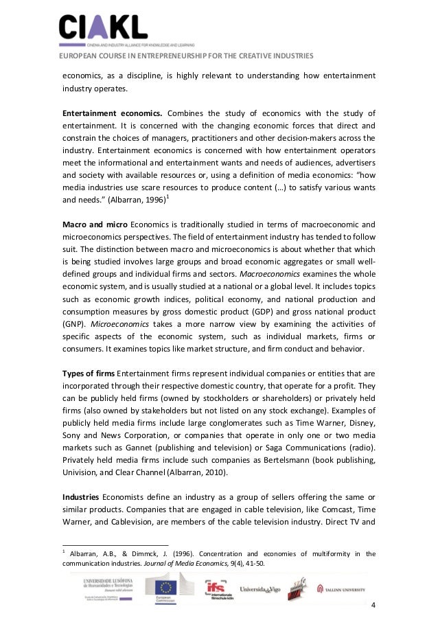 4. 4.                                                                       EUROPEAN COURSE IN ENTREPRENEURSHIP FOR THE CREATIVE INDUSTRIES                                                                 4    economics,  as  a  discipline,  is  highly  relevant  to  understanding  how  entertainment  industry operates.    Entertainment  economics.  Combines  the  study  of  economics  with  the  study  of  entertainment.  It  is  concerned  with  the  changing  economic  forces  that  direct  and  constrain the choices of managers, practitioners and other decision‐makers across the  industry.  Entertainment  economics  is  concerned  with  how  entertainment  operators  meet the informational and entertainment wants and needs of audiences, advertisers  and society with available resources or, using a definition of media economics: “how  media industries use scare resources to produce content (…) to satisfy various wants  and needs.” (Albarran, 1996)1     Macro and micro Economics is traditionally studied in terms of macroeconomic and  microeconomics perspectives. The field of entertainment industry has tended to follow  suit. The distinction between macro and microeconomics is about whether that which  is being studied involves large groups and broad economic aggregates or small well‐ defined groups and individual firms and sectors. Macroeconomics examines the whole  economic system, and is usually studied at a national or a global level. It includes topics  such  as  economic  growth  indices,  political  economy,  and  national  production  and  consumption measures by gross domestic product (GDP) and gross national product  (GNP).  Microeconomics  takes  a  more  narrow  view  by  examining  the  activities  of  specific  aspects  of  the  economic  system,  such  as  individual  markets,  firms  or  consumers. It examines topics like market structure, and firm conduct and behavior.    Types of firms Entertainment firms represent individual companies or entities that are  incorporated through their respective domestic country, that operate for a profit. They  can be publicly held firms (owned by stockholders or shareholders) or privately held  firms (also owned by stakeholders but not listed on any stock exchange). Examples of  publicly held media firms include large conglomerates such as Time Warner, Disney,  Sony  and  News  Corporation,  or  companies  that  operate  in  only  one  or  two  media  markets such as Gannet (publishing and television) or Saga Communications (radio).  Privately held media firms include such companies as Bertelsmann (book publishing,  Univision, and Clear Channel (Albarran, 2010).    Industries  Economists  define  an  industry  as  a  group  of  sellers  offering  the  same  or  similar products. Companies that are engaged in cable television, like Comcast, Time  Warner, and Cablevision, are members of the cable television industry. Direct TV and                                                               1   Albarran,  A.B.,  &  Dimmck,  J.  (1996).  Concentration  and  economies  of  multiformity  in  the  communication industries. Journal of Media Economics, 9(4), 41‐50.
