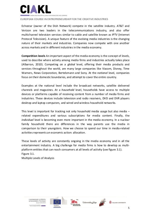5. 5.                                                                       EUROPEAN COURSE IN ENTREPRENEURSHIP FOR THE CREATIVE INDUSTRIES                                                                 5    Echostar  (owner  of  the  Dish  Network)  compete  in  the  satellite  industry.  AT&T  and  Verizon  are  two  leaders  in  the  telecommunications  industry,  and  also  offer  multichannel television services similar to cable and satellite known as IPTV (Internet  Protocol Television). A unique feature of the evolving media industries is the changing  nature  of  their  markets  and  industries.  Companies  now  compete  with  one  another  across markets and in different industries in the media economy.    Competition levels An important aspect of the media economy is the concept of levels,  used to describe where activity among media firms and industries actually takes place  (Albarran,  2010).  Competing  on  a  global  level,  offering  their  media  products  and  services throughout the world, are many large companies like Viacom, Disney, Time  Warners, News Corporation, Bertelsmann and Sony. At the national level, companies  focus on their domestic boundaries, and attempt to cover the entire country.     Examples  at  the  national  level  include  the  broadcast  networks,  satellite  delivered  channels  and  magazines.  At  a  household  level,  households  have  access  to  multiple  devices or platforms capable of receiving content from a number of media firms and  industries. These devices include television and radio receivers, DVD and DVR players  desktop and laptop computers, and wired and wireless household networks.     This level is important for tracking not only household media usage but also media – related  expenditures  and  various  subscriptions  for  media  content.  Finally,  the  individual level is becoming even more important in the media economy. In a nuclear  family  household  there  are  differences  in  the  way  parents  use  the  media  in  comparison to their youngsters. How we choose to spend our time in media‐related  activities represents an economic action: allocation.     These levels of activity are constantly ongoing in the media economy and in all the  entertainment industry. A big challenge for media firms is how to develop as multi‐ platform entities that can reach consumers at all levels of activity (see figure 3.1).  Figure 3.1.  Multiple Levels of Analysis