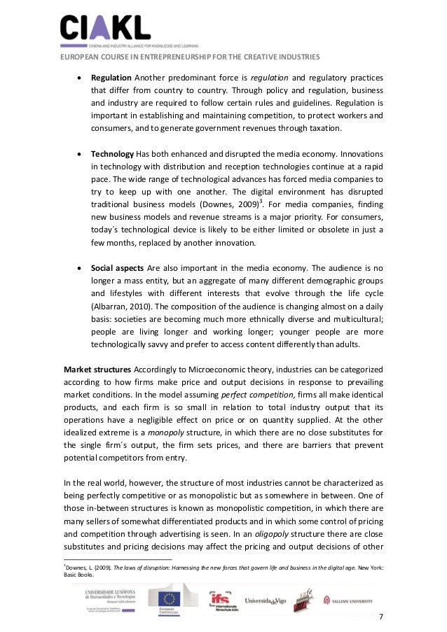 7. 7.                                                                       EUROPEAN COURSE IN ENTREPRENEURSHIP FOR THE CREATIVE INDUSTRIES                                                                 7     Regulation Another predominant force is regulation and regulatory practices  that  differ  from  country  to  country.  Through  policy  and  regulation,  business  and industry are required to follow certain rules and guidelines. Regulation is  important in establishing and maintaining competition, to protect workers and  consumers, and to generate government revenues through taxation.     Technology Has both enhanced and disrupted the media economy. Innovations  in technology with distribution and reception technologies continue at a rapid  pace. The wide range of technological advances has forced media companies to  try  to  keep  up  with  one  another.  The  digital  environment  has  disrupted  traditional  business  models  (Downes,  2009)3 .  For  media  companies,  finding  new business models and revenue streams is a major priority. For consumers,  today´s technological device is likely to be either limited or obsolete in just a  few months, replaced by another innovation.     Social aspects Are also important in the media economy. The audience is no  longer a mass entity, but an aggregate of many different demographic groups  and  lifestyles  with  different  interests  that  evolve  through  the  life  cycle  (Albarran, 2010). The composition of the audience is changing almost on a daily  basis: societies are becoming much more ethnically diverse and multicultural;  people  are  living  longer  and  working  longer;  younger  people  are  more  technologically savvy and prefer to access content differently than adults.    Market structures Accordingly to Microeconomic theory, industries can be categorized  according  to  how  firms  make  price  and  output  decisions  in  response  to  prevailing  market conditions. In the model assuming perfect competition, firms all make identical  products,  and  each  firm  is  so  small  in  relation  to  total  industry  output  that  its  operations  have  a  negligible  effect  on  price  or  on  quantity  supplied.  At  the  other  idealized extreme is a monopoly structure, in which there are no close substitutes for  the  single  firm´s  output,  the  firm  sets  prices,  and  there  are  barriers  that  prevent  potential competitors from entry.    In the real world, however, the structure of most industries cannot be characterized as  being perfectly competitive or as monopolistic but as somewhere in between. One of  those in‐between structures is known as monopolistic competition, in which there are  many sellers of somewhat differentiated products and in which some control of pricing  and competition through advertising is seen. In an oligopoly structure there are close  substitutes and pricing decisions may affect the pricing and output decisions of other                                                               3 Downes, L. (2009). The laws of disruption: Harnessing the new forces that govern life and business in the digital age. New York:  Basic Books.