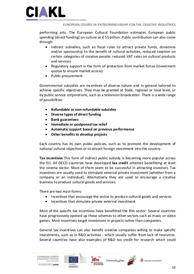 10. 10.                                                                      EUROPEAN COURSE IN ENTREPRENEURSHIP FOR THE CREATIVE INDUSTRIES  10    performing  arts.  The  European  Cultural  Foundation  estimates  European  public  spending (direct funding) on culture at € 55 billion. Public contribution can also come  through:   Indirect  subsidies,  such  as  fiscal  rules  to  attract  private  funds,  donations  and/or sponsorship to the benefit of cultural activities, reduced taxation on  certain categories of creative people, reduced VAT rates on cultural products  and services   Regulatory support in the form of protection from market forces (investment  quotas to ensure market access)   Public procurement    Governmental subsidies are incentives of diverse nature and in general tailored to  achieve specific objectives. They may be granted at State, regional or local level, or  by public service corporations, such as a television broadcaster. There is a wide range  of possibilities:      Refundable or non‐refundable subsidies   Diverse types of direct funding   Bank guarantees   Immediate or postponed tax relief   Automatic support based on previous performance   Other benefits to develop projects    Each  country  has  its  own  public  policies,  such  as  to  promote  the  development  of  national cultural objectives or to attract foreign investment into the country.     Tax incentives This form of indirect public subsidy is becoming more popular across  the EU. All OECD countries have developed tax credit schemes benefitting at least  the cinema sector. Most of them seem to be successful in attracting investors. Tax  incentives are usually used to stimulate external private investment (whether from a  company  or  an  individual).  Alternatively  they  are  used  to  encourage  a  creative  business to produce cultural goods and services.     There are two main forms:    Incentives that encourage the sector to produce cultural goods and services   Incentives that stimulate private external investment    Most of the specific tax incentives have benefitted the film sector. Several countries  have progressively opened up these schemes to other sectors such as music or video  games. Most incentives target investment in projects rather than companies.     General tax incentives can also benefit creative companies willing to make specific  investments, such as in R&D activities ‐ which usually suffer from lack of resources.  Several  countries  have  also  examples  of  R&D  tax  credit  for  research  which  could