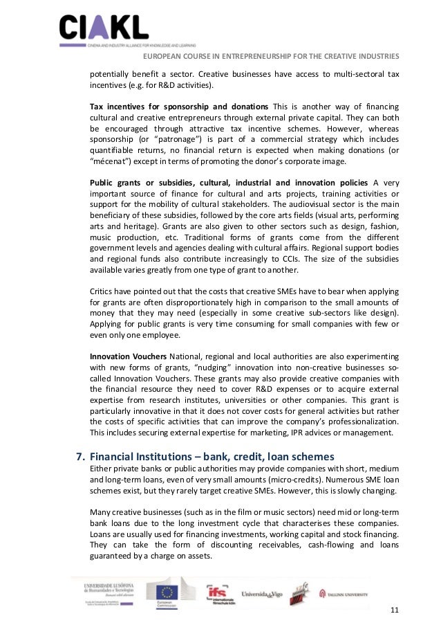 11. 11.                                                                      EUROPEAN COURSE IN ENTREPRENEURSHIP FOR THE CREATIVE INDUSTRIES  11    potentially  benefit  a  sector.  Creative  businesses  have  access  to  multi‐sectoral  tax  incentives (e.g. for R&D activities).     Tax  incentives  for  sponsorship  and  donations  This  is  another  way  of  financing  cultural and creative entrepreneurs through external private capital. They can both  be  encouraged  through  attractive  tax  incentive  schemes.  However,  whereas  sponsorship  (or  “patronage”)  is  part  of  a  commercial  strategy  which  includes  quantifiable  returns,  no  financial  return  is  expected  when  making  donations  (or  “mécenat”) except in terms of promoting the donor’s corporate image.     Public  grants  or  subsidies,  cultural,  industrial  and  innovation  policies  A  very  important  source  of  finance  for  cultural  and  arts  projects,  training  activities  or  support for the mobility of cultural stakeholders. The audiovisual sector is the main  beneficiary of these subsidies, followed by the core arts fields (visual arts, performing  arts  and  heritage).  Grants  are  also  given  to  other  sectors  such  as  design,  fashion,  music  production,  etc.  Traditional  forms  of  grants  come  from  the  different  government levels and agencies dealing with cultural affairs. Regional support bodies  and  regional  funds  also  contribute  increasingly  to  CCIs.  The  size  of  the  subsidies  available varies greatly from one type of grant to another.     Critics have pointed out that the costs that creative SMEs have to bear when applying  for grants are often disproportionately high in comparison to the small amounts of  money  that  they  may  need  (especially  in  some  creative  sub‐sectors  like  design).  Applying for public grants is very time consuming for small companies with few or  even only one employee.    Innovation Vouchers National, regional and local authorities are also experimenting  with  new  forms  of  grants,  “nudging”  innovation  into  non‐creative  businesses  so‐ called Innovation Vouchers. These grants may also provide creative companies with  the  financial  resource  they  need  to  cover  R&D  expenses  or  to  acquire  external  expertise  from  research  institutes,  universities  or  other  companies.  This  grant  is  particularly innovative in that it does not cover costs for general activities but rather  the costs of specific activities that can improve the company’s professionalization.  This includes securing external expertise for marketing, IPR advices or management.    7. Financial Institutions – bank, credit, loan schemes  Either private banks or public authorities may provide companies with short, medium  and long‐term loans, even of very small amounts (micro‐credits). Numerous SME loan  schemes exist, but they rarely target creative SMEs. However, this is slowly changing.    Many creative businesses (such as in the film or music sectors) need mid or long‐term  bank  loans  due  to  the  long  investment  cycle  that  characterises  these  companies.  Loans are usually used for financing investments, working capital and stock financing.  They  can  take  the  form  of  discounting  receivables,  cash‐flowing  and  loans  guaranteed by a charge on assets.