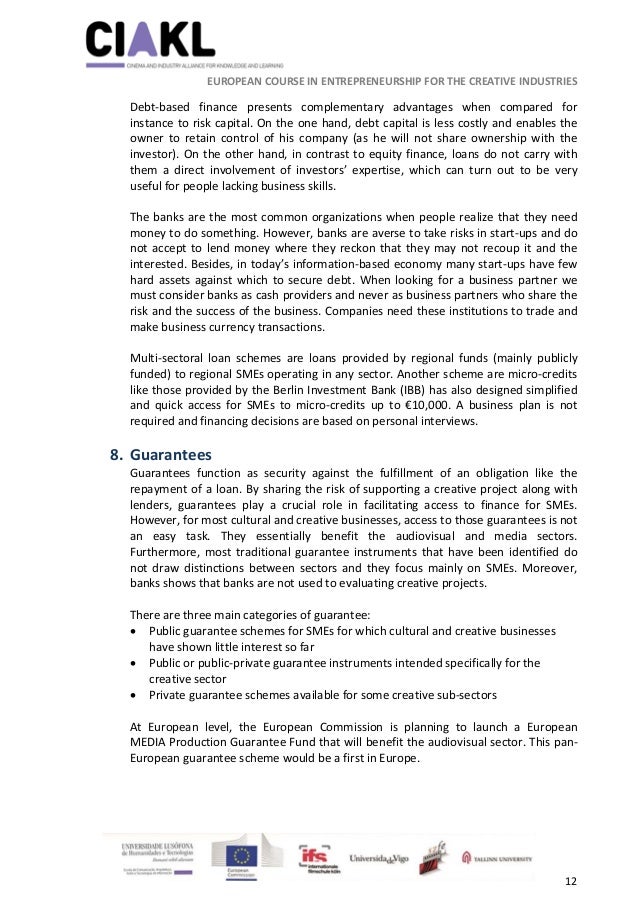 12. 12.                                                                      EUROPEAN COURSE IN ENTREPRENEURSHIP FOR THE CREATIVE INDUSTRIES  12    Debt‐based  finance  presents  complementary  advantages  when  compared  for  instance to risk capital. On the one hand, debt capital is less costly and enables the  owner  to  retain  control  of  his  company  (as  he  will  not  share  ownership  with  the  investor). On the other hand, in contrast to equity finance, loans do not carry with  them  a  direct  involvement  of  investors’  expertise,  which  can  turn  out  to  be  very  useful for people lacking business skills.    The banks are the most common organizations when people realize that they need  money to do something. However, banks are averse to take risks in start‐ups and do  not accept to lend money where they reckon that they may not recoup it and the  interested. Besides, in today’s information‐based economy many start‐ups have few  hard assets against which to secure debt. When looking for a business partner we  must consider banks as cash providers and never as business partners who share the  risk and the success of the business. Companies need these institutions to trade and  make business currency transactions.    Multi‐sectoral  loan  schemes  are  loans  provided  by  regional  funds  (mainly  publicly  funded) to regional SMEs operating in any sector. Another scheme are micro‐credits  like those provided by the Berlin Investment Bank (IBB) has also designed simplified  and  quick  access  for  SMEs  to  micro‐credits  up  to  €10,000.  A  business  plan  is  not  required and financing decisions are based on personal interviews.     8. Guarantees  Guarantees  function  as  security  against  the  fulfillment  of  an  obligation  like  the  repayment of a loan. By sharing the risk of supporting a creative project along with  lenders,  guarantees  play  a  crucial  role  in  facilitating  access  to  finance  for  SMEs.  However, for most cultural and creative businesses, access to those guarantees is not  an  easy  task.  They  essentially  benefit  the  audiovisual  and  media  sectors.  Furthermore, most traditional guarantee instruments that have been identified do  not draw distinctions between sectors and they focus mainly on SMEs. Moreover,  banks shows that banks are not used to evaluating creative projects.    There are three main categories of guarantee:    Public guarantee schemes for SMEs for which cultural and creative businesses  have shown little interest so far   Public or public‐private guarantee instruments intended specifically for the  creative sector   Private guarantee schemes available for some creative sub‐sectors    At  European  level,  the  European  Commission  is  planning  to  launch  a  European  MEDIA Production Guarantee Fund that will benefit the audiovisual sector. This pan‐ European guarantee scheme would be a first in Europe.